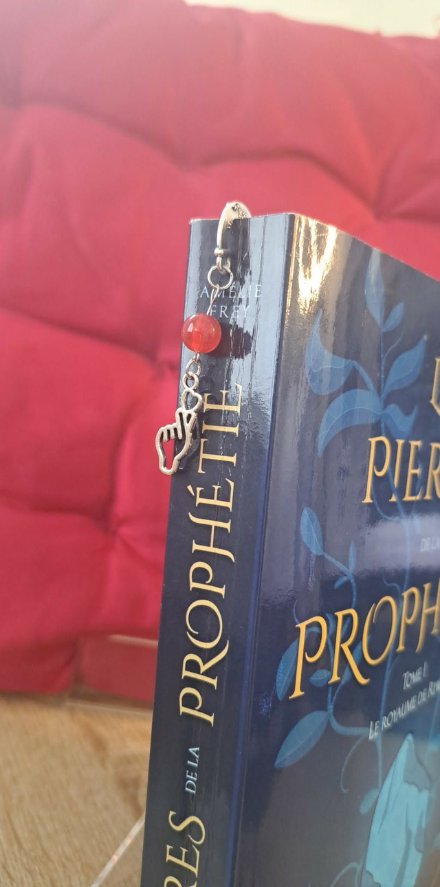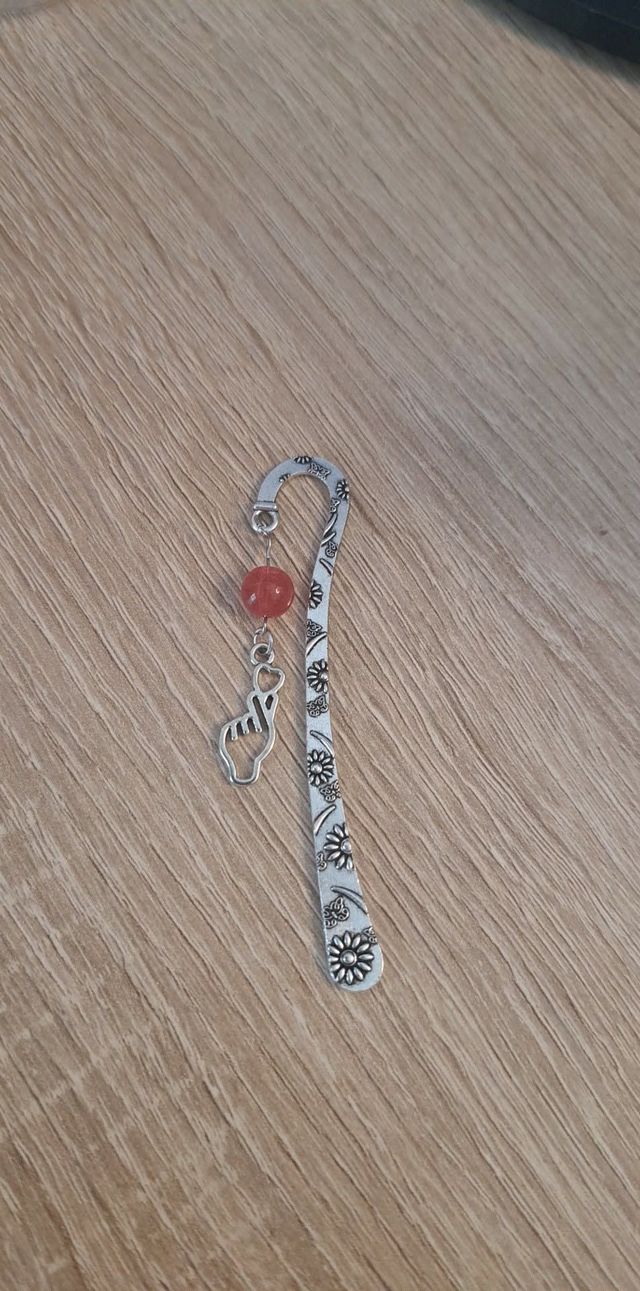 Marque-page en métal argenté. Tige fine et légèrement courbe. Breloque cœur et perle rouge suspendues. Visible une fois le marque-page en place. Convient aux livres et carnets.