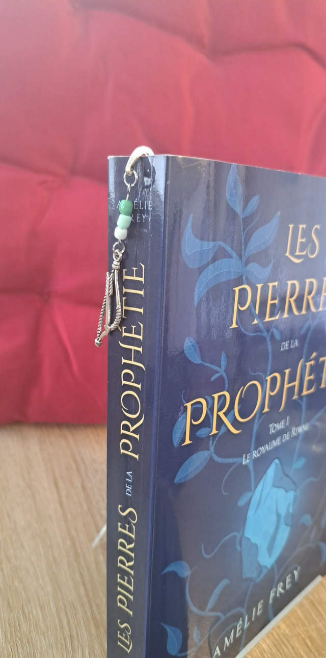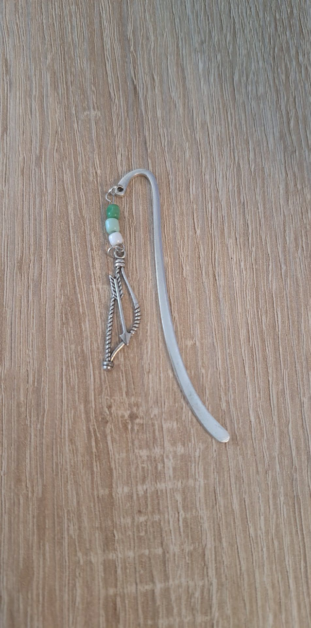 Marque-page en métal argenté, assemblé à la main. La forme est fine et légèrement courbe pour se glisser facilement entre les pages sans abîmer le livre. La breloque arc et flèche est accompagnée de perles vertes et blanches, visibles une fois le marque-page en place. Un accessoire discret, pensé pour un usage quotidien, aussi bien pour les romans que pour les carnets.